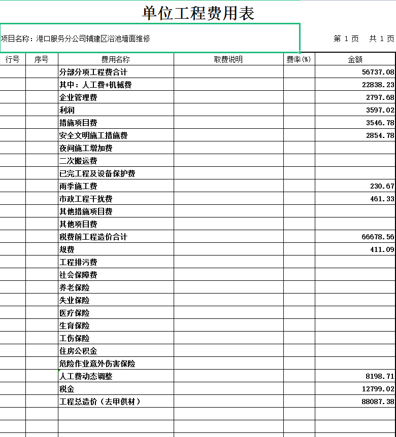 浴池墙面维修工程预算书包括:单位工程费用表、单位工程费用表(各专业取费综合报表)、单位工程概预算表(主材单列)、单位工程人材机汇总表。