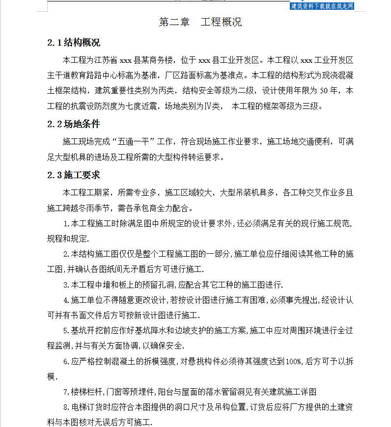 本工程的结构形式为现浇混凝土框架结构,建筑重要性类别为丙类,结构安全等级为二级,设计使用年限为50年,本工程的抗震设防烈度为七度近震,场地类别为Ⅳ类, 本工程的框架等级为三级。本工程工期紧,所需专业多,施工区域较大,大型吊装机具多,各工种交叉作业多且施工跨越冬雨季节,需各承包商全力配合。