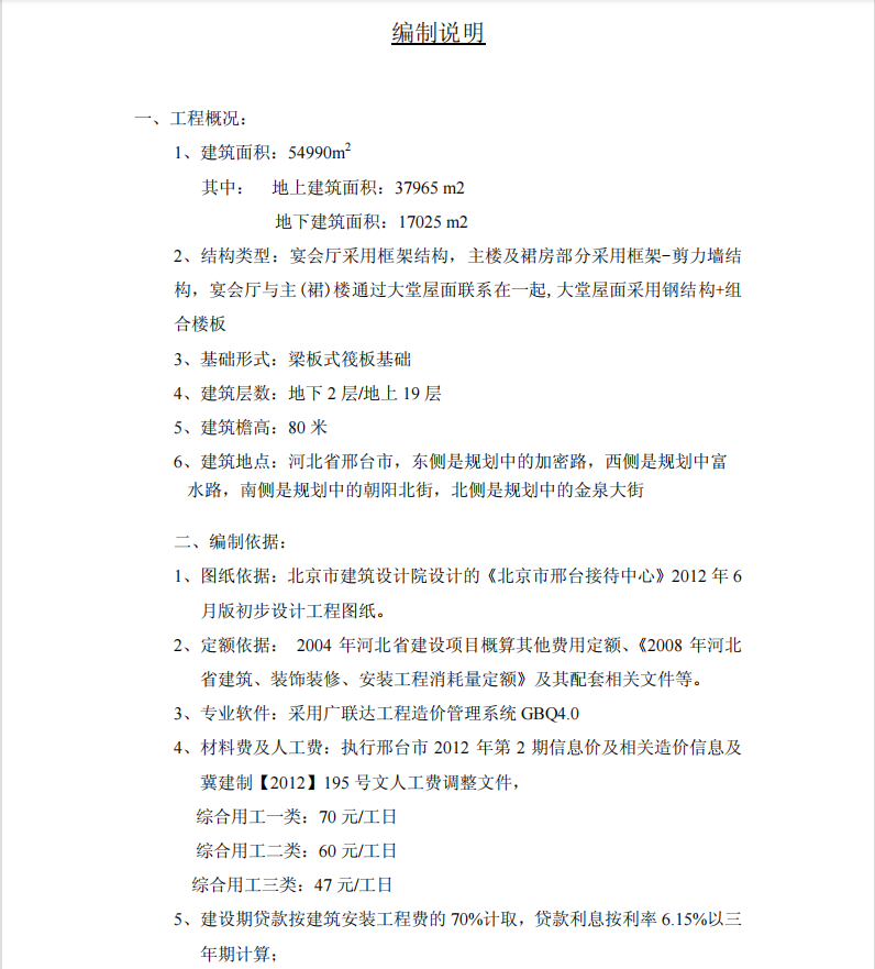 建筑面积: 54990m2。其中:地上建筑面积: 37965 m2。地下建筑面积: 17025 m2。结构类型:宴会厅采用框架结构,主楼及裙房部分采用框架-剪力墙结构,宴会厅与主(裙)楼通过大堂屋面联系在一起,大堂屋面采用钢结构+组合楼板。