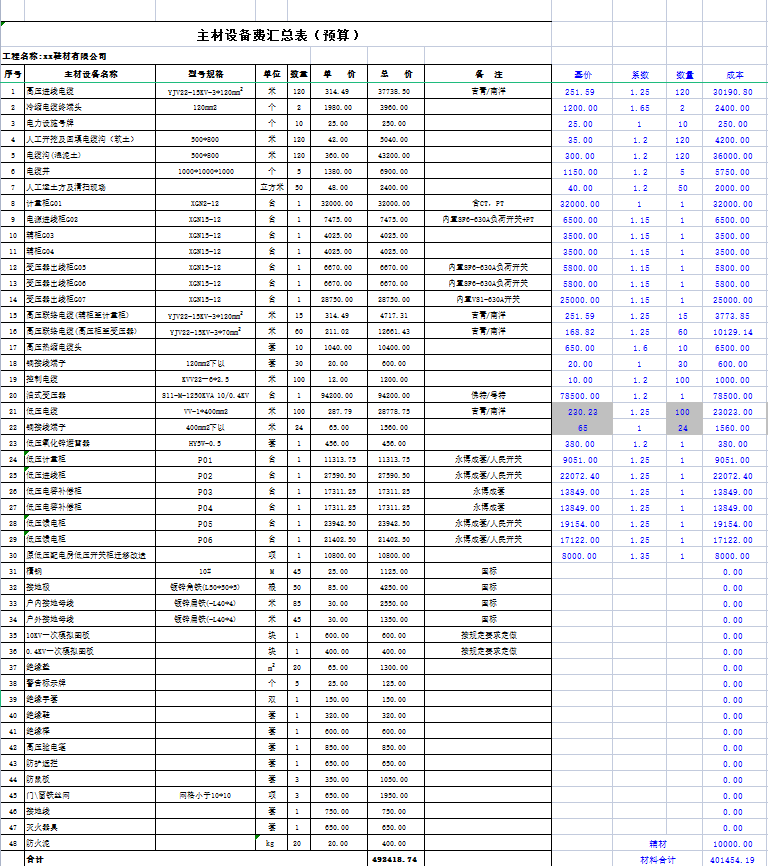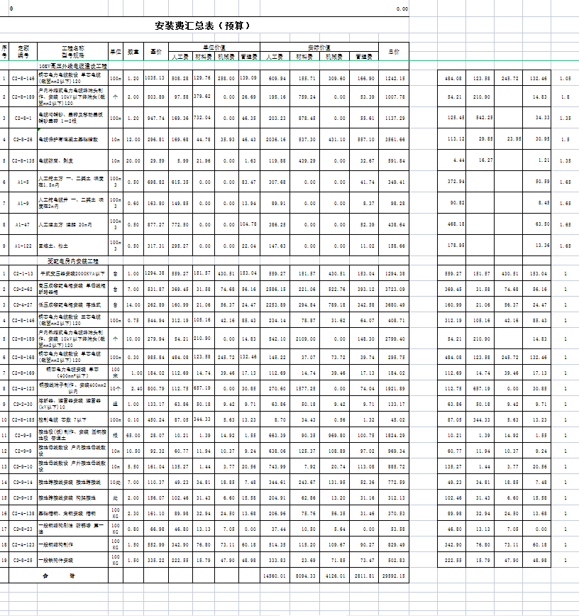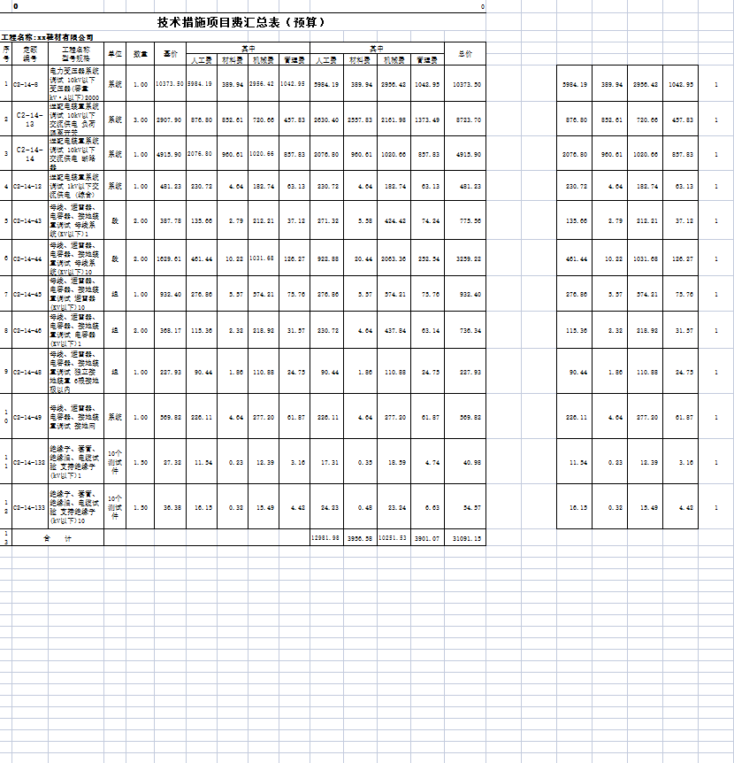 工业厂区变配电工程预算书包括:安装工程总价表(预算) 、 主材设备费汇总表(预算)、安装费汇总表(预算)、技术措施项目费汇总表(预算)、其它措施项目费汇总表(预算)。