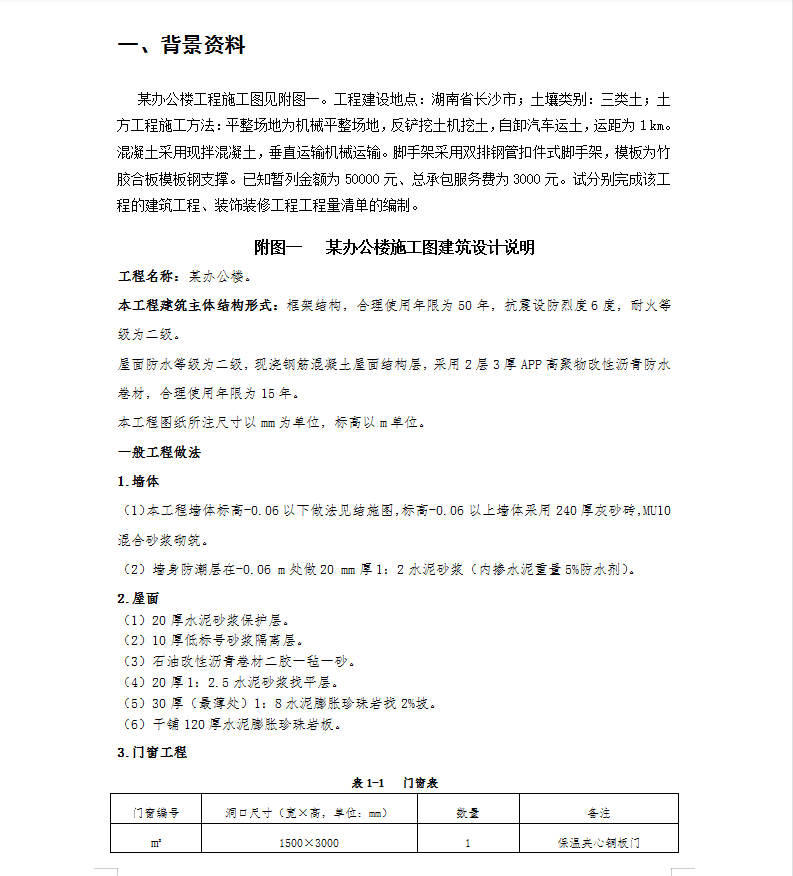 工程名称:某办公楼。本工程建筑主体结构形式:框架结构,合理使用年限为50年,抗震设防烈度6度,耐火等级为二级。屋面防水等级为二级,现浇钢筋混凝土屋面结构层,采用2层3厚APP高聚物改性沥青防水卷材,合理使用年限为15年。本工程图纸所注尺寸以mm为单位,标高以m单位。
