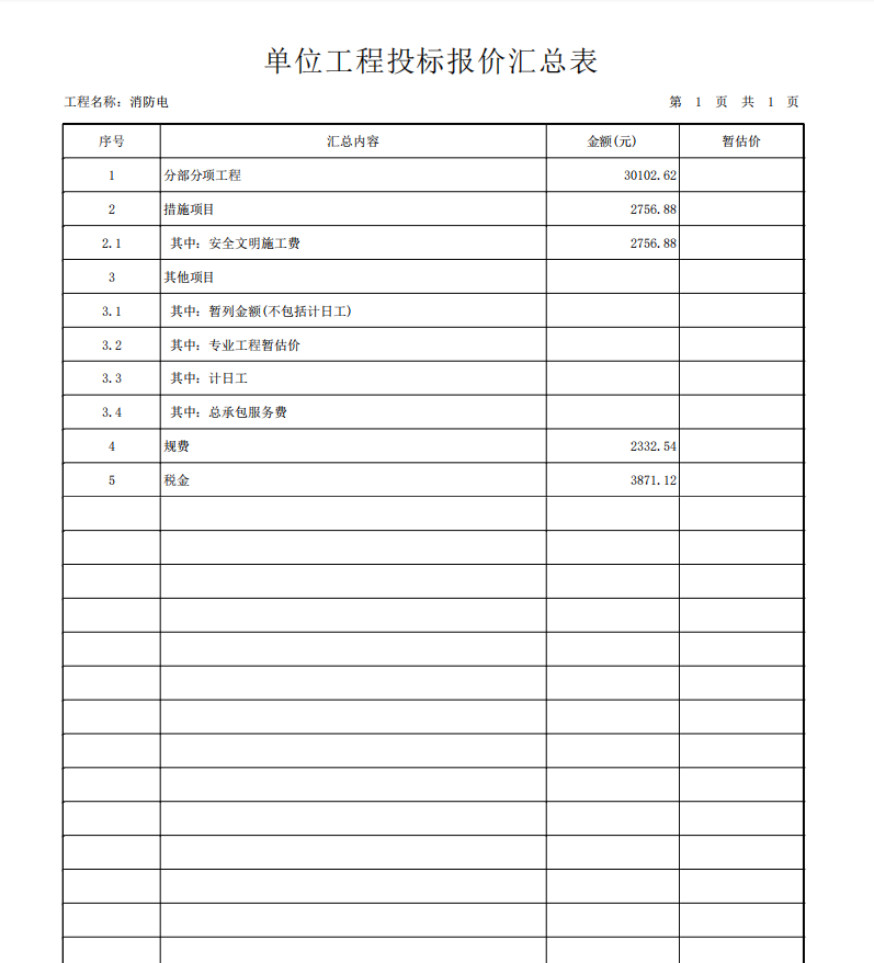 Ïû·Àµç¹¤³ÌÁ¿¼ÆËãʵÀý°üÀ¨£ºµ¥Î»¹¤³ÌͶ±ê±¨¼Û»ã×Ü±í¡¢·Ö²¿·ÖÏ³ÌºÍµ¥¼Û´ëÊ©ÏîÄ¿Çåµ¥Óë¼Æ¼Û±í¡¢·Ö²¿·ÖÏ³ÌºÍµ¥¼Û´ëÊ©ÏîÄ¿Çåµ¥Óë¼Æ¼Û±í¡¢µ¥¼Û´ëÊ©ÏîÄ¿Çåµ¥Óë¼Æ¼Û±í¡¢×ۺϵ¥¼Û·ÖÎö±í¡¢×ܼ۴ëÊ©ÏîÄ¿Çåµ¥Óë¼Æ¼Û±í¡¢ÔÝÁнð¶îÃ÷ϸ±í¡¢²ÄÁϺ͹¤³ÌÉ豸ÔݹÀ¼Û±íµÈ¡£