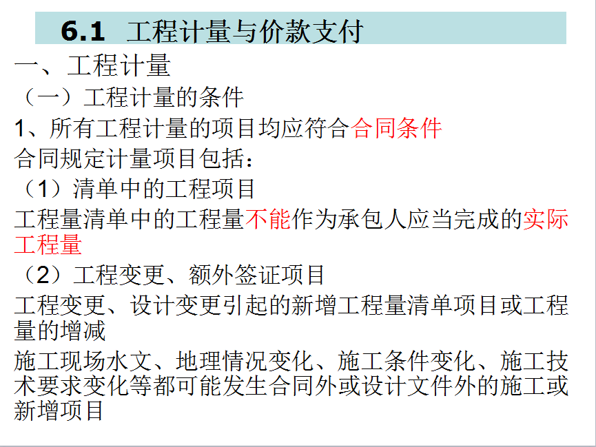 工程计量:(一)工程计量的条件:1、所有工程计量的项目均应符合合同条件,合同规定计量项目包括:(1)清单中的工程项目:工程量清单中的工程量不能作为承包人应当完成的实际工程量(2)工程变更、额外签证项目:工程变更、设计变更引起的新增工程量清单项目或工程量的增减,施工现场水文、地理情况变化、施工条件变化、施工技术要求变化等都可能发生合同外或设计文件外的施工或新增项目,质量必须达到合同双方约定的质量要求: 承包人所完成的工程项目的质量必须经监理工程师检查并达到合同规范要求,监理工程师在工程报验申请单上签字确认后方可进行计量。