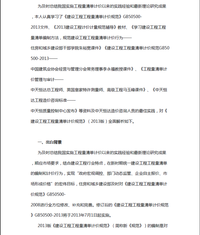 出台背景:为及时总结我国实施工程量清单计价以来的实践经验和最新理论研究成果,顺应市场要求,结合建设工程行业特点,在新时期统一建设工程工程量清单的编制和计价行为,实现“政府宏观调控、部门动态监管、企业自主报价、市场形成价格”的宏伟目标,住房和城乡建设部及时对《建设工程工程量清单计价规范》GB50500-2008进行全方位修改、补充和完善。修订后的《建设工程工程量清单计价规范》GB50500-2013将于2013年7月1日起实施。2013版《建设工程工程量清单计价规范》(简称新《规范》)的编制是对2008版《建设工程工程量清单计价规范》(简称原《规范》)的修改、补充和完善,它不仅较好地解决了原《规范》执行以来存在的主要问题,而且对清单编制和计价的指导思想进行了深化,在“政府宏观调控、部门动态监管、企业自主报价、市场决定价格”的基础上,新《规范》规定了合同价款约定、合同价款调整、合同价款中期支付、竣工结算支付以及合同解除的价款结算与支付、合同价款争议的解决方法,展现了加强市场监管的措施,强化了清单计价的执行力度。