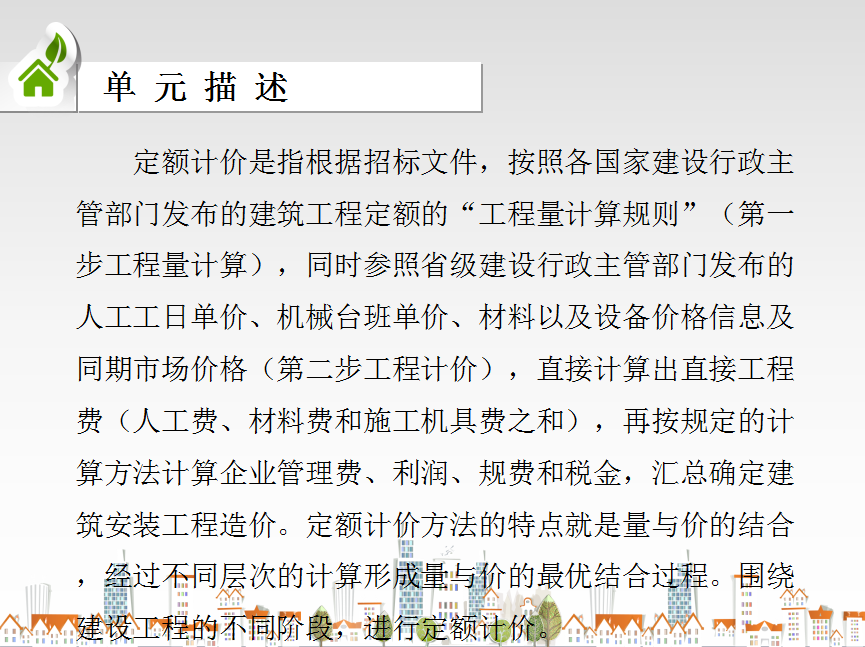 定额计价是指根据招标文件,按照各国家建设行政主管部门发布的建筑工程定额的“工程量计算规则”(第一步工程量计算),同时参照省级建设行政主管部门发布的人工工日单价、机械台班单价、材料以及设备价格信息及同期市场价格(第二步工程计价),直接计算出直接工程费(人工费、材料费和施工机具费之和),再按规定的计算方法计算企业管理费、利润、规费和税金,汇总确定建筑安装工程造价。定额计价方法的特点就是量与价的结合,经过不同层次的计算形成量与价的最优结合过程。围绕建设工程的不同阶段,进行定额计价。