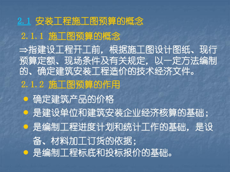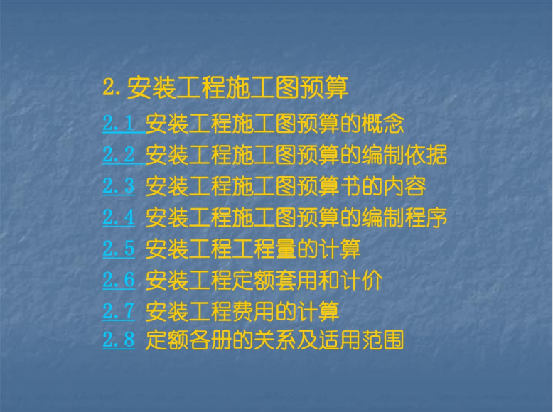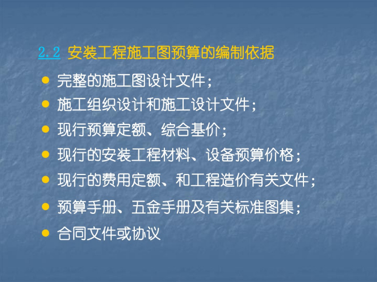 安装工程造价施工图预算学习课件的主要内容:安装工程施工图预算的概念、安装工程施工图预算的编制依据、安装工程施工图预算书的内容、安装工程施工图预算的编制程序、安装工程工程量的计算、安装工程定额套用和计价、安装工程费用的计算、定额各册的关系及适用范围。