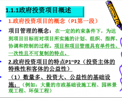 政府投资项目管理概述:掌握政府投资项目的概念、了解政府投资项目的特点、了解政府投资项目管理相关制度、熟悉政府投资项目基本程序。项目管理的概念:在-一定的约束条件下,为达到项目目标而对项目所实施的计划、组织、指挥、协调和控制的过程。项目和项且管理具有单件性、二.次性且不可复制的特点。