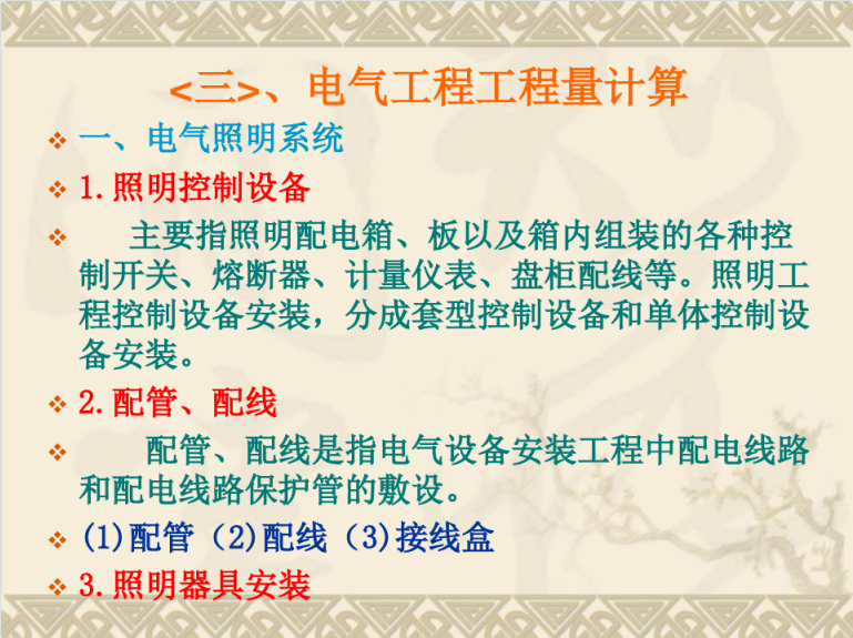 安装工程造价员电气实例精解课件主要内容包括建筑电气施工图的识读、电气施工图识图案例、电气工程工程量计算
