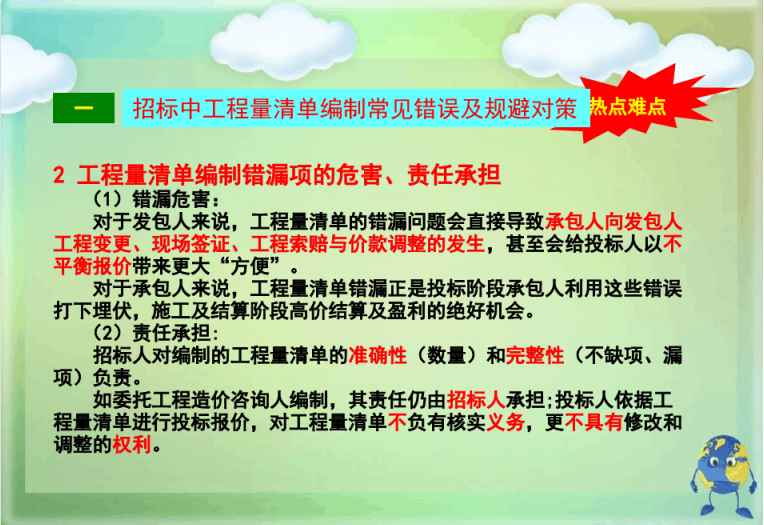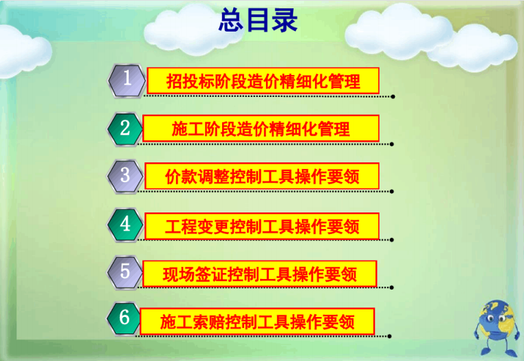 本课件主要内容包括招投标阶段造价精细化管理、施工阶段造价精细化管理、价款调整控制工具操作要领、工程变更控制工具操作要领、现场签证控制工具操作要领、施工索赔控制工具操作要领
