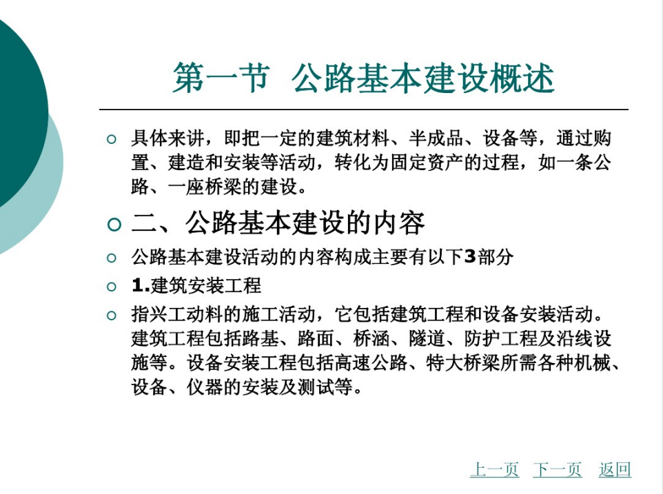 公路基本建设是指有关公路固定资产的建筑、购置、安装及与其相关的如征地拆迁、勘察设计、施工监理等工作,是公路交通运输业为了扩大再生产(即提高运输能力)而进行的增加固定资产的建设工作。