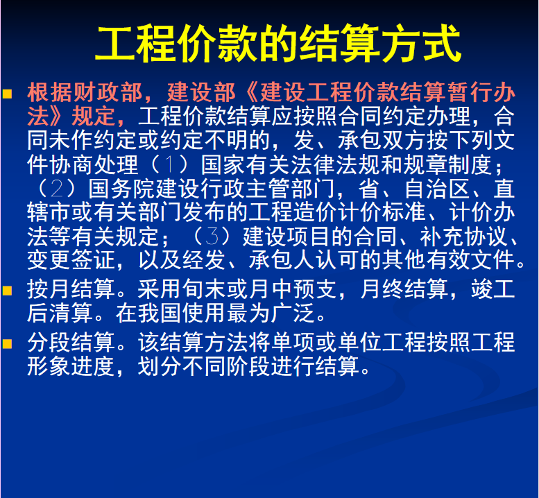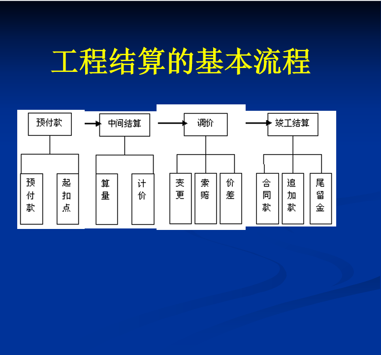 工程价款结算与竣工决算包括:工程价款的结算方式、工程预付款、工程进度款的支付( 中间结算)、工程竣工结算、工程价款价差调整的主要方法。工程款的支付可分为三个主要过程:即开工前预付,施工过程中作中间结算,办理竣工验收手续后进行竣工结算。