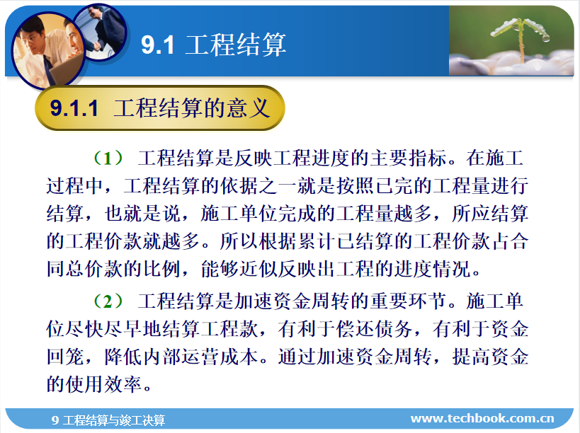 工程结算是指施工企业按照承包合同和已完工程量向建设单位(业主)办理工程价款清算的经济文件。工程建设周期长,耗用资金数额大,为使建筑安装企业在施工中耗用的资金及时得到补偿,需要对工程价款进行中间结算(进度款结算)、年终结算,全部工程竣工验收后应进行竣工结算。