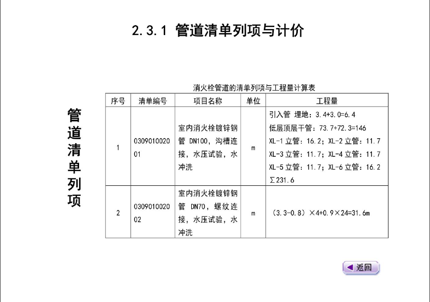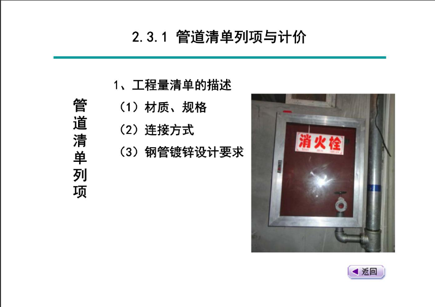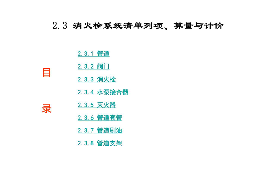 消火栓系统清单列项、 算量与计价主要内容是:管道、阀门、消火栓、水泵接合器、灭火器、管道套管、管道刷油、管道支架。