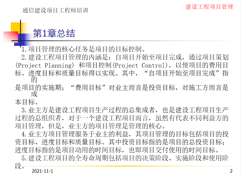 项目的实施阶段包括设计前的准备阶段、设计阶段、施工阶段、动用前准备阶段和保修期。业主方项目管理的最重要任务是项目的安全管理,而投资控制、进度控制、质量控制和合同管理则主要涉及物质利益。设计方项目管理的目标包括设计的成本目标和项目的投资目标、设计的进度目标、设计的质量目标。