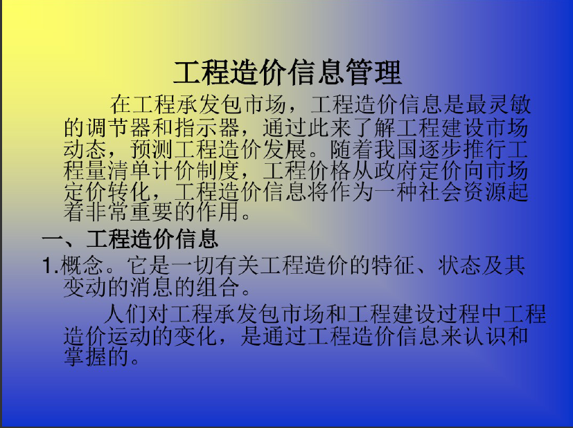 在工程承发包市场,工程造价信息是最灵敏的调节器和指示器,通过此来了解工程建设市场动态,预测工程造价发展。随着我国逐步推行工程量清单计价制度,工程价格从政府定价向市场定价转化,工程造价信息将作为种社会资源起着非常重要的作用