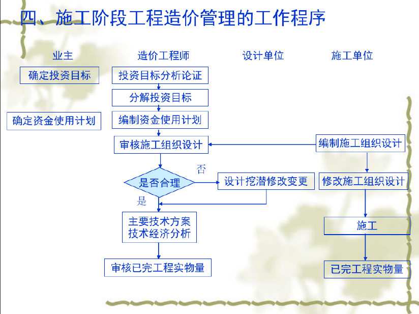 按照承包人实际完成的工程量,以合同价为基础,同时考虑物价.上张因素所引起的造价的提高,考虑到设计中难以预计的而在施工阶段实际发生的工程变更及费用,合理确定工程结算价款。做好招投标工作;严格定额管理,按合同约定拨付工程款、严格控制工程变更、施工索赔;加强价格信息管理。