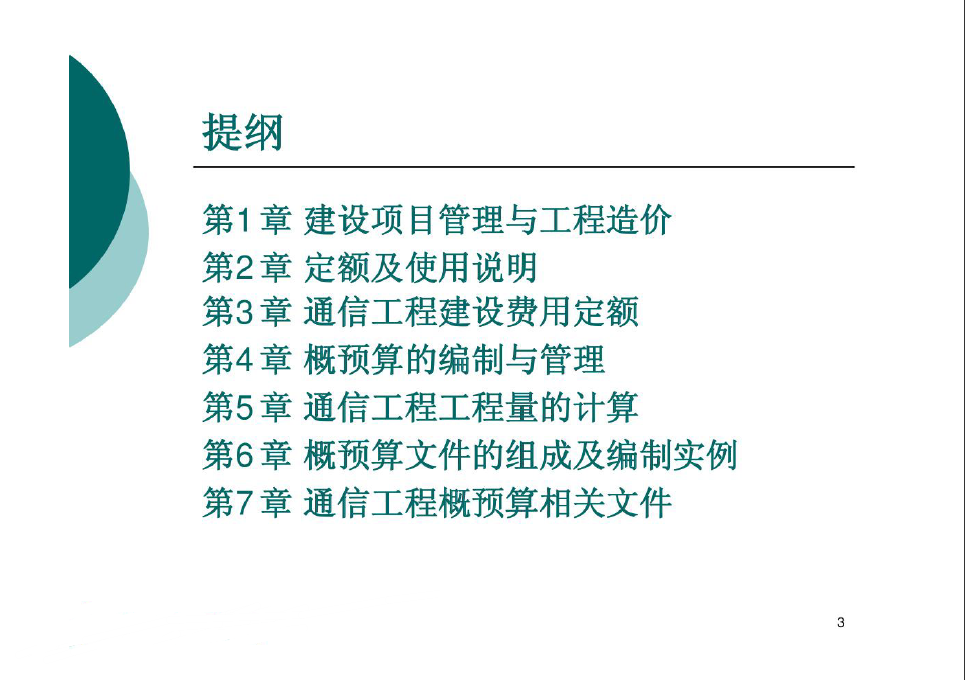 通信工程概预算基础知识培训的主要内容是:建设项目管理与工程造价、定额及使用说明、通信工程建设费用定额、概预算的编制与管理、通信工程工程量的计算、概预算文件的组成及编制实例、通信工程概预算相关文件。