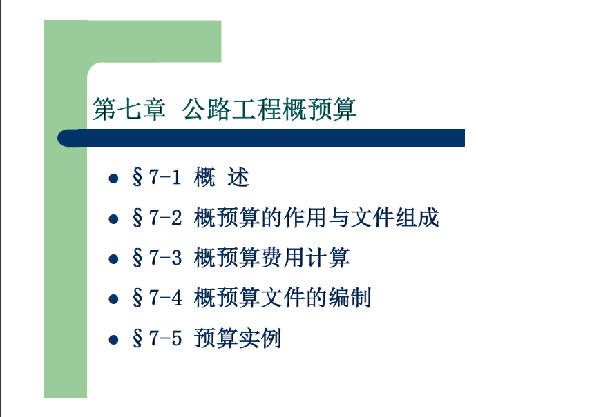 公路工程概预算的主要内容是:概述、概预算的作用与文件组成、概预算费用计算、概预算文件的编制、预算实例。