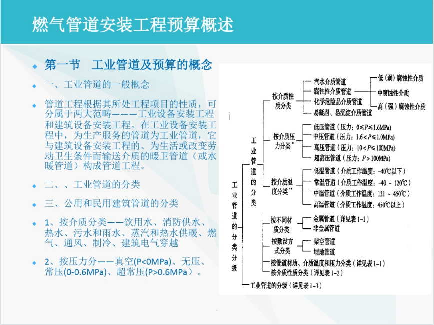 管道工程根据其所处工程项目的性质,可分属于两大范畴-- -工业设备安装工程和建筑设备安装工程。在工业设备安装工程中,为生产服务的管道为工业管道,它与建筑设备安装工程的、为生活或改变劳动卫生条件而输送介质的暖卫管道(或水暖管道)构成管道工程。