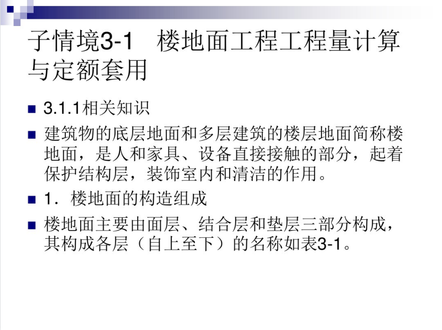 建筑物的底层地面和多层建筑的楼层地面简称楼.地面,是人和家具、设备直接接触的部分,起着保护结构层,装饰室内和清洁的作用。楼地面主要由面层、结合层和垫层三部分构成。按设计要求选用不同材质和相应配合比,经施工现场整体浇注的楼地面面层称为整体式楼地面。一般有:水泥砂浆地面、细石混凝土地面、水磨石地面、菱苦土地面等。按设计要求选用不同材质和相应配合比,经施工现场整体浇注的楼地面面层称为整体式楼地面。一般有:水泥砂浆地面、细石混凝土地面、水磨石地面、菱苦土地面等。