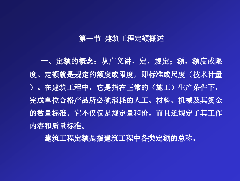 定额的概念:从广义讲,定,规定;额,额度或限度。定额就是规定的额度或限度,即标准或尺度(技术计量)。在建筑工程中,它是指在正常的(施工)生产条件下,完成单位合格产品所必须消耗的人工、材料、机械及其资金的数量标准。它不仅仅是规定量和价,而且还规定了其工作内容和质量标准。建筑工程定额是指建筑工程中各类定额的总称。