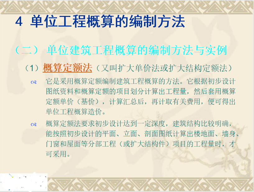 概算定额法(又叫扩大单价法或扩大结构定额法)它是采用概算定额编制建筑工程概算的方法。它根据初步设计图纸资料和概算定额的项目划分计算出工程量,然后套用概算定额单价(基价),计算汇总后,再计取有关费用,便可得出单位工程概算造价。
