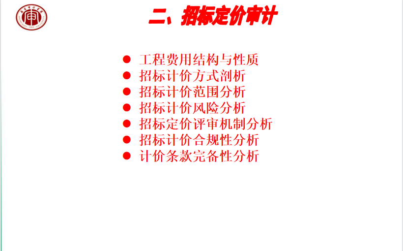 工程造价审计—投资审计培训的主要内容是:工程费用结构与性质、招标计价方式剖析、招标计价范围分析、招标计价风险分析、招标定价评审机制分析、招标计价合规性分析、计价条款完备性分析。