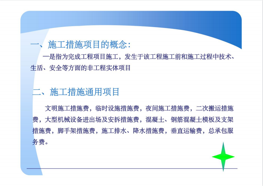 施工措施项目的概念:是指为完成工程项目施工,发生于该工程施工前和施工过程中技术、生活、安全等方面的非工程实体项目。