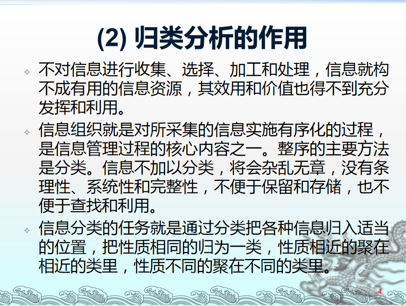 归类分析的作用:不对信息进行收集、选择、加工和处理,信息就构不成有用的信息资源,其效用和价值也得不到充分发挥和利用。信息组织就是对所采集的信息实施有序化的过程,是信息管理过程的核心内容之一。整序的主要方法是分类。信息不加以分类,将会杂乱无章,没有条理性、系统性和完整性,不便于保留和存储,也不便于查找和利用。