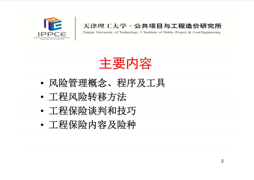 工程风险管理实务的主要内容是:风险管理概念、程序及工具、工程风险转移方法、工程保险谈判和技巧、工程保险内容及险种。
