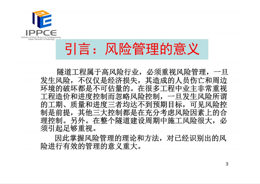 隧道工程属于高风险行业,必须重视风险管理,一旦发生风险,不仅仅是经济损失,其造成的人员伤亡和周边环境的破坏都是不可估量的。在很多工程中业主非常重视工程造价和进度控制而忽略风险控制,一旦发生风险所谓的工期、质量和进度三者均达不到预期目标,可风险控制是前提,其他三大控制都是在充分考虑风险因素上的合理控制。另外。在整个隧道建设周期中施工风险很大,必须引起足够重视。