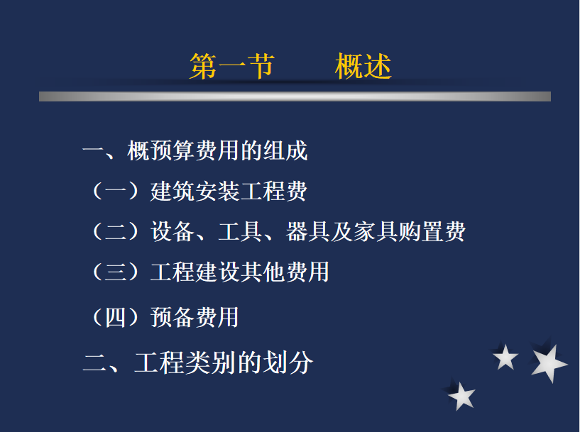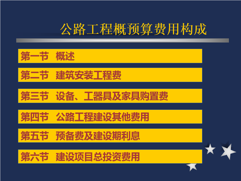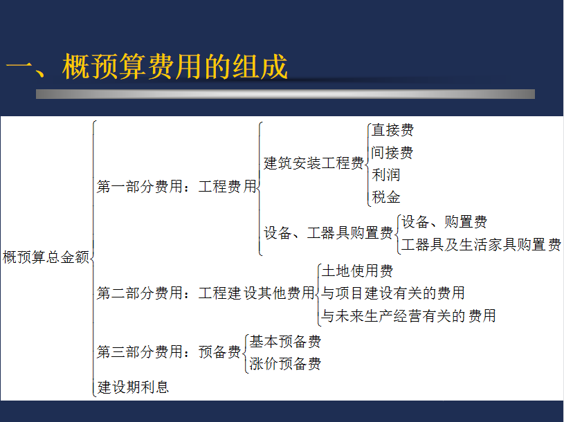 公路工程概预算费用组成的主要内容是:概述、建筑安装工程费、设备、工器具及家具购置费、公路工程建设其他费用、预备费及建设期利息、建设项目总投资费用。
