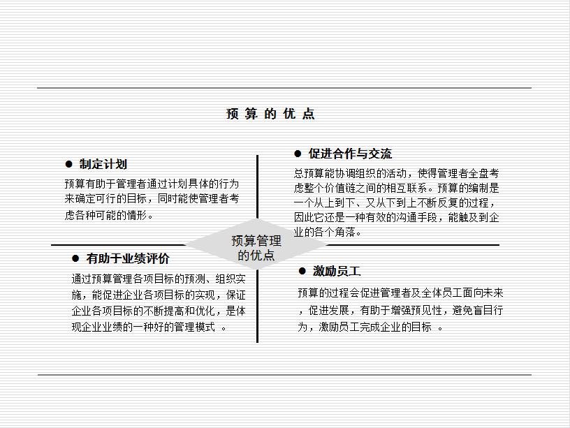 预算管理的优点:预算有助于管理者通过计划具体的行为来确定可行的目标,同时能使管理者考虑各种可能的情形。总预算能协调组织的活动,使得管理者全盘考虑整个价值链之间的相互联系。预算的编制是一个从上到下、又从下到上不断反复的过程,因此它还是一种有效的沟通手段,能触及到企业的各个角落。
