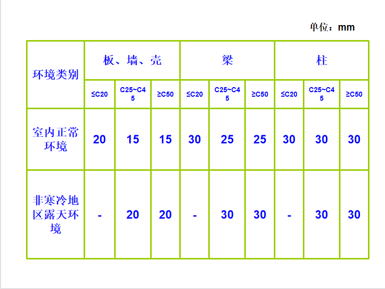 设计规范规定:纵向受力的普通钢筋及预应力钢筋,其混凝土保护层厚度,不应小于受力钢筋直径,并应符合下表中规定