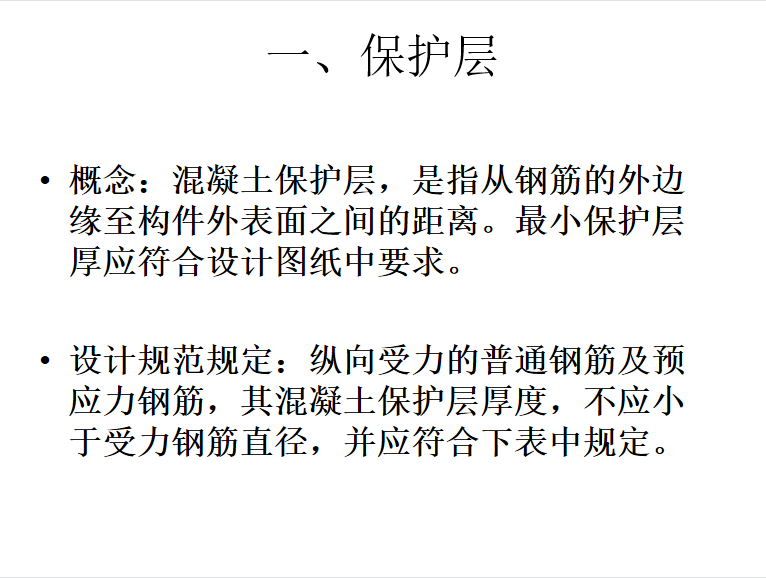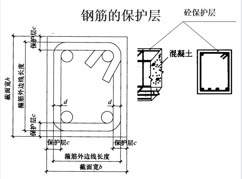 概念:混凝土保护层,是指从钢筋的外边缘至构件外表面之间的距离。最小保护层厚应符合设计图纸中要求。