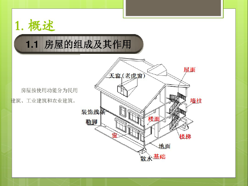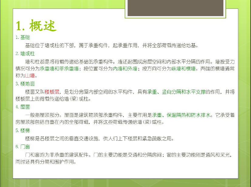 楼面又叫楼板层,是划分房屋内部空间的水平构件,具有承重、竖向分隔和水平支撑的作用,并将楼板层上的荷载传递给墙(梁)或柱。