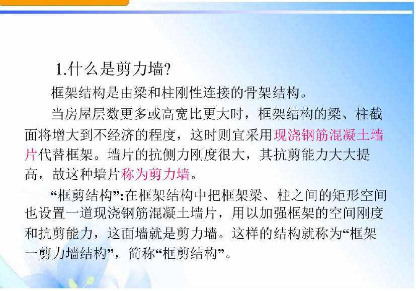 16G101图集剪力墙平法识图课件包括剪力墙的平法设计规则、剪力墙柱的钢筋构造、剪力墙身的钢筋构造、剪力墙梁的钢筋构造、剪力墙洞口补强构造、剪力墙识图操练、剪力墙钢筋计算操练