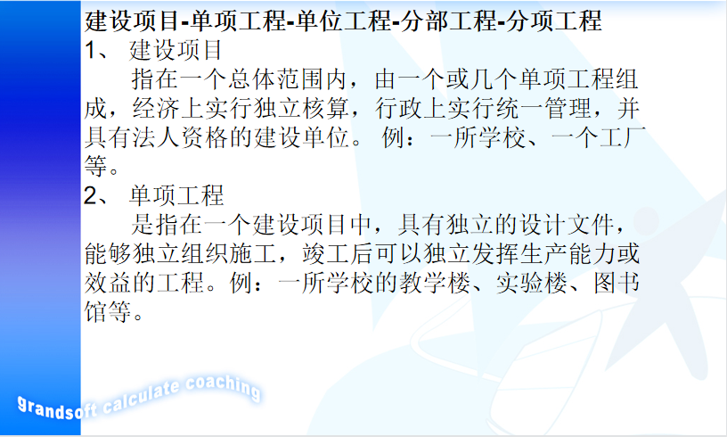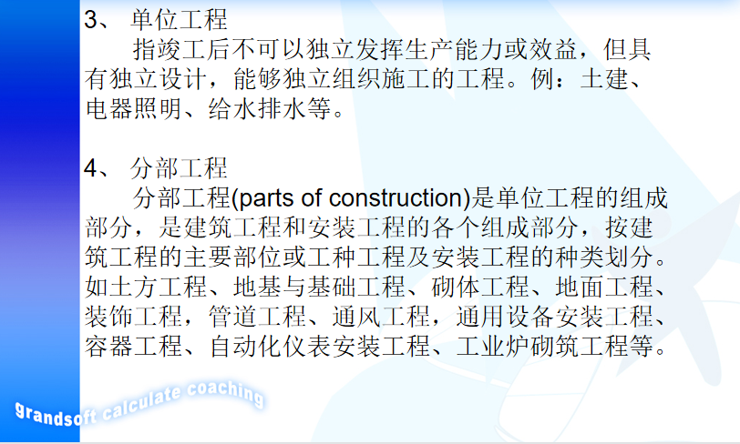 分部工程(parts of construction)是单位工程的组成部分,是建筑工程和安装工程的各个组成部分,按建筑工程的主要部位或工种工程及安装工程的种类划分。如土方工程、地基与基础工程、砌体工程、地面工程、装饰工程,管道工程、通风工程,通用设备安装工程、容器工程、自动化仪表安装工程、工业炉砌筑工程等。