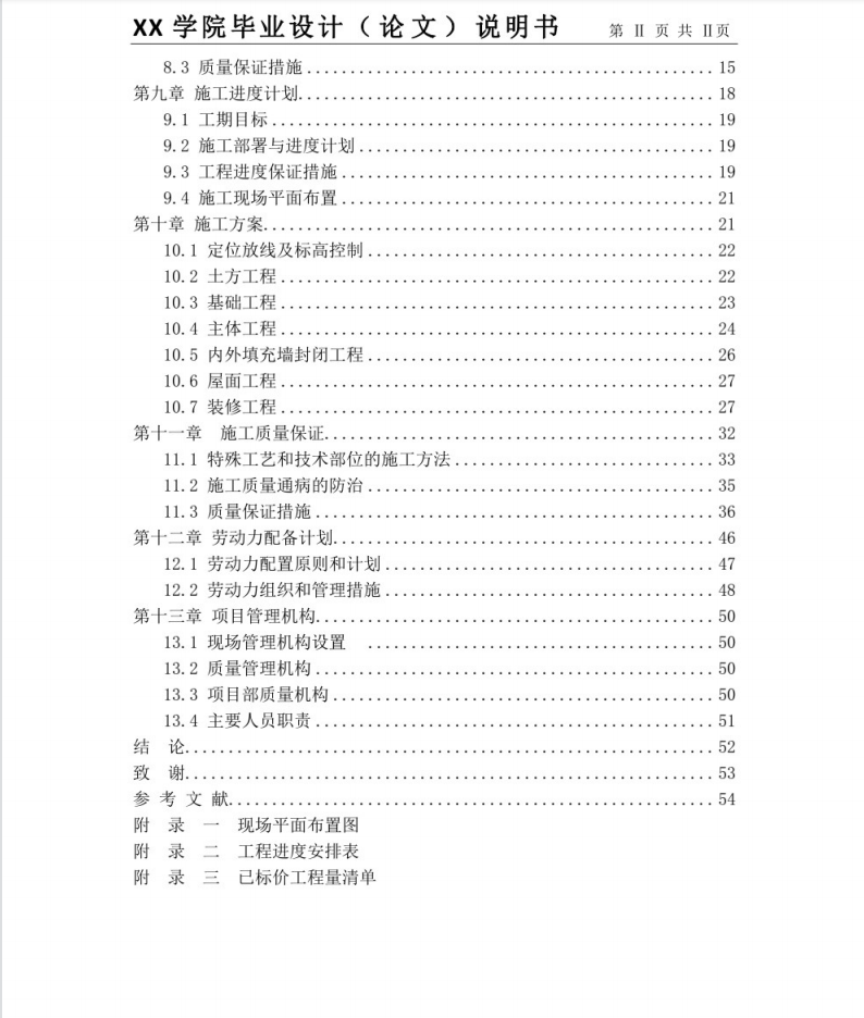 本毕业设计是根据xx省xx市xxxx新区住宅小区3-8号楼招标文件的招标须知、合同条件、技术规范、图纸以及其他有关的文件而编制的投标文件。该工程总建筑面积约7500平米,其中的设计包括:商务标、技术标以及结论说明。其中商务标的内容包括文件编制的依据、范围、工程量的计算过程及投标函、投标保证金、授权委托书、法定代表人的身份证明等。技术标则包括工程概况、施工组织及部署、施工方案、劳动力的配备计划、各项管理措施等,是从人、材料、机具方面协调进行施工布置。