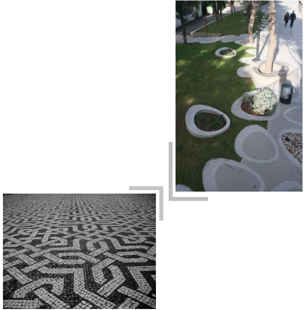 近似构成是基本形的变化,是重复的轻度变异,没有重复的严格规律,又不失规律感,近似求大同,有小异,可以取得统一又富于变化的效果,近似的地面铺装使人百看不厌、趣味无穷。