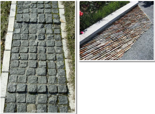 肌理构成即指将不同物质表面的肌理通过一定的手段进行构成设计。我们在铺装构成中把肌理的触觉带入人为体验感中,让肌理成为一种特殊的景观地面语言,以此带给人们更多的心理暗示,唤起人们对地面铺装的共鸣。