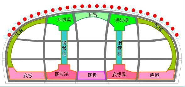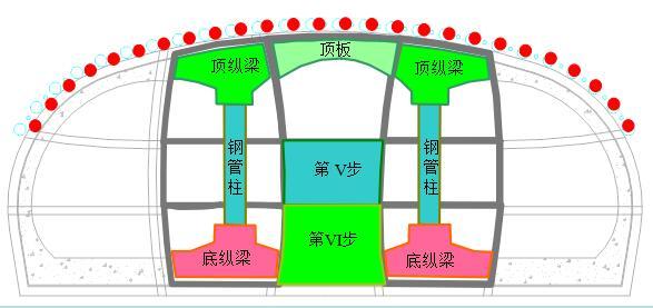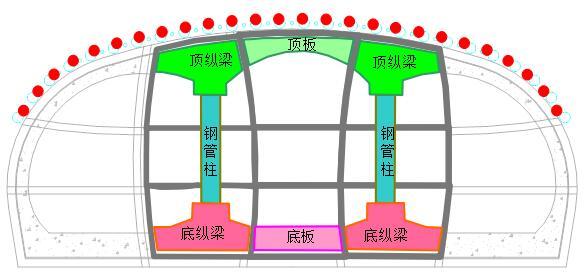 其主要原理是在车站立柱和边墙的顶部和底部施作小导洞,通过导洞采用桩基的施工方法施作车站立柱和边墙,而后小断面开挖施作车站顶板,最后在车站顶板的保护下开挖车站主体并进行车站其余结构的施工。