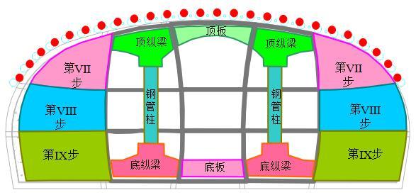 先自上而下对称施工柱洞初支,再由下而上施作柱洞二衬,建立起梁、柱支撑体系。柱洞完成后,施工两个柱洞中间的中洞初支和二衬,形成整个大中洞稳定体系。再对称自上而下施工两侧洞初支,最后纵向分段自下而上对称施作二衬,完成结构闭合。