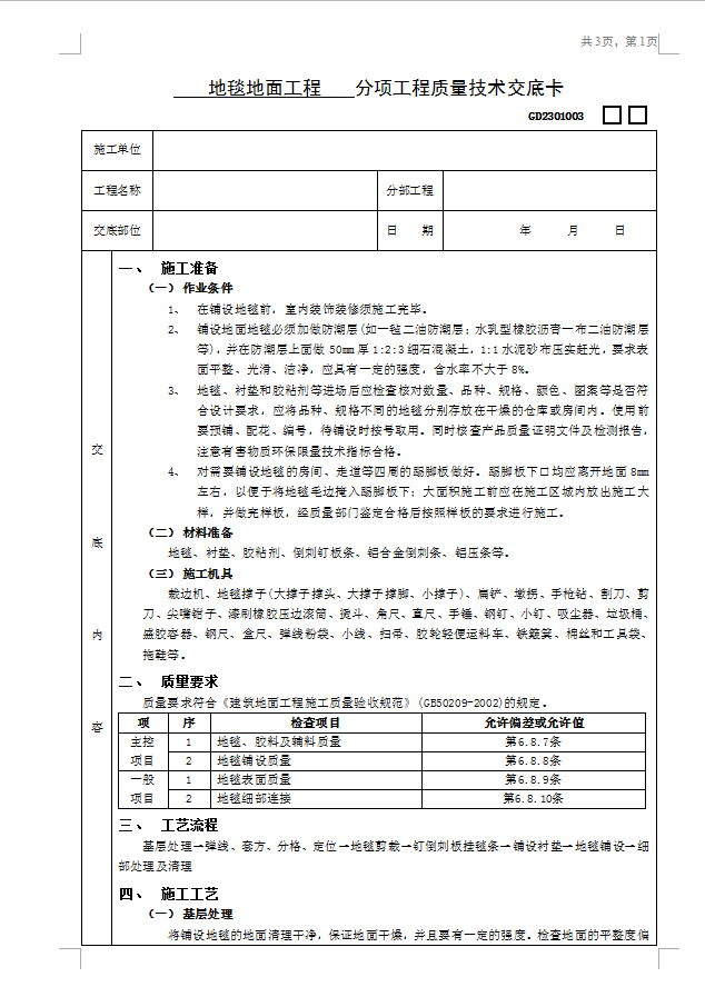 施工工艺:(一)基层处理:将铺设地毯的地面清理干净,保证地面干燥,并且要有一定的强度。检查地面的平整度偏差不大于4mm,地面基层含水率不大于8%,满足要求后再进行下一道工序。(二)弹线、套方、分格、定位
