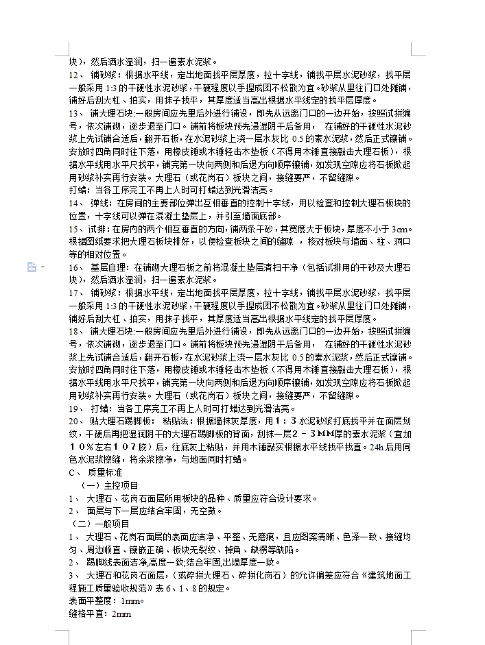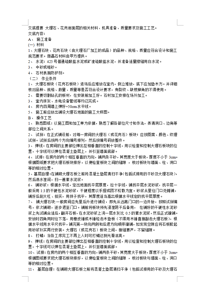 操作工艺 :1、 熟悉图纸:以施工图和加工单为依据,熟悉了解各部位尺寸和作法,弄清洞口、边角等部位之间关系。2、 试拼:在正式铺设前,对每一房间的大理石(或花岗石)板块;应按图案、颜色、纹理试拼。试拼后按两个方向编号排列,然后按编号码放整齐。3、 弹线:在房间的主要部位弹出互相垂直的控制十字线,用以检查和控制大理石板块的位置,十字线可以弹在混凝土垫层上,并引至墙面底部。 4、 试排:在房内的两个相互垂直的方向,铺两条干砂,其宽度大于板块,厚度不小于3cm。根据图纸要求把大理石板块排好,以便检查板块之间的缝隙 ,核对板块与墙面、柱、洞口等的相对位置。 5、 基层自理:在铺砌大理石板之前将混凝土垫层清扫干净(包括试排用的干砂及大理石块),然后洒水湿润,扫一遍素水泥浆。 6、 铺砂浆:根据水平线,定出地面找平层厚度,拉十字线,铺找平层水泥砂浆,找平层一般采用1:3的干硬性水泥砂浆,干硬程度以手捏成团不松散为宜。砂浆从里往门口处摊铺,铺好后刮大杠、拍实,用抹子找平,其厚度适当高出根据水平线定的找平层厚度。7、 铺大理石块:一般房间应先里后外进行铺设,即先从远离门口的一边开始,按照试拼编号,依次铺砌,逐步退至门口。铺前将板块预先浸湿阴干后备用, 在铺好的干硬性水泥砂浆上先试铺合适后,翻开石板,在水泥砂浆上浇一层水灰比 0.5的素水泥浆,然后正式镶铺。安放时四角同时往下落,用橡皮锤或木锤轻击木垫板(不得用木锤直接敲击大理石板),根据水平线用水平尺找平,铺完第一块向两侧和后退方向顺序镶铺,如发现空隙应将石板掀起用砂浆补实再行安装。大理石(或花岗石)板块之间,接缝要严,不留缝隙。 8、 打蜡:当各工序完工不再上人时可打蜡达到光滑洁亮。