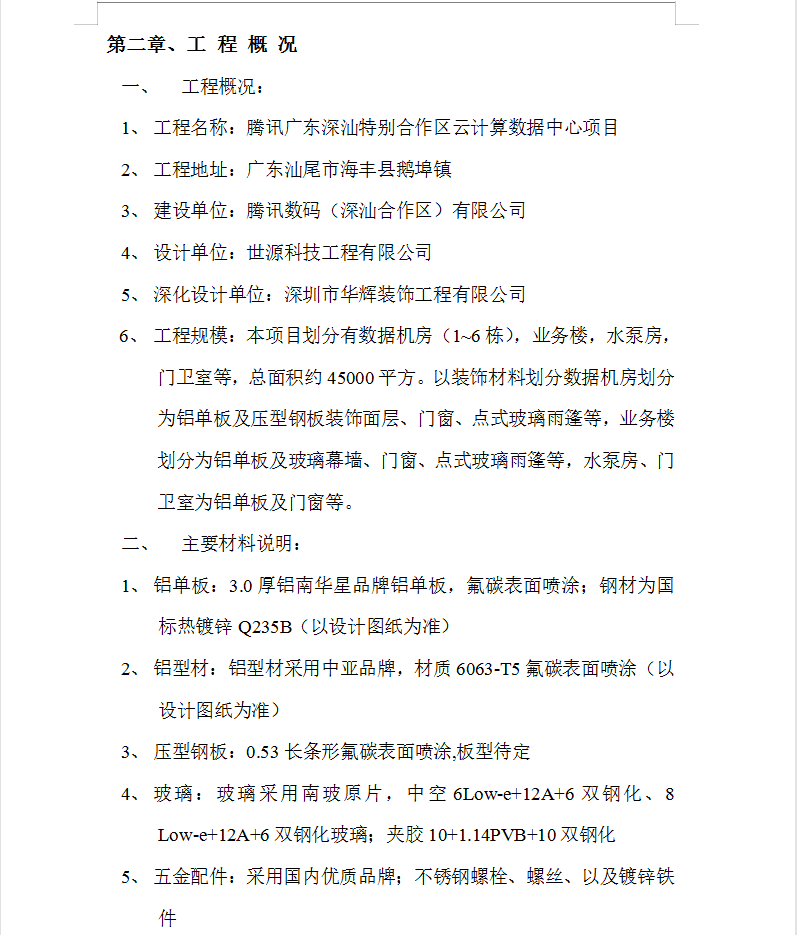 本项目划分有数据机房(1~6栋),业务楼,水泵房,门卫室等,总面积约45000平方。以装饰材料划分数据机房划分为铝单板及压型钢板装饰面层、门窗、点式玻璃雨篷等,业务楼划分为铝单板及玻璃幕墙、门窗、点式玻璃雨篷等,水泵房、门卫室为铝单板及门窗等。