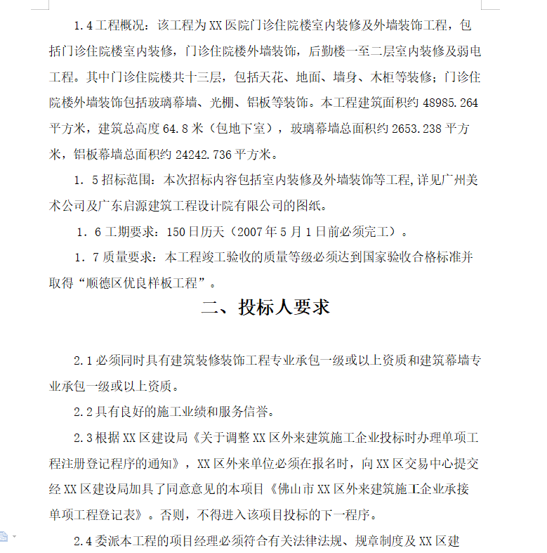 该工程为XX医院门诊住院楼室内装修及外墙装饰工程,包括门诊住院楼室内装修,门诊住院楼外墙装饰,后勤楼一至二层室内装修及弱电工程。其中门诊住院楼共十三层,包括天花、地面、墙身、木柜等装修;门诊住院楼外墙装饰包括玻璃幕墙、光棚、铝板等装饰。本工程建筑面积约48985.264平方米,建筑总高度64.8米(包地下室),玻璃幕墙总面积约2653.238平方米,铝板幕墙总面积约24242.736平方米。