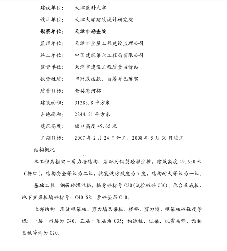 本工程为框架-剪力墙结构,基础为钢筋砼灌注桩,建筑高度49. 650米(檐口),结构安全等级为二级,抗震设防烈度为7度,结构耐火等级为一级。基础工程:钢筋砼灌注桩,桩身砼标号C30 (试验桩砼C30);承台及底板、地下室梁板墙砼标号: C40 S8;素砼垫层C10.