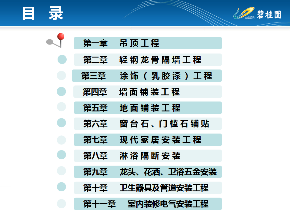 主要内容:吊顶工程;轻钢龙骨隔墙工程;涂饰(乳胶漆)工程;墙面铺装工程;地面铺装工程