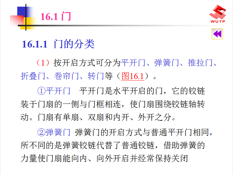 本章提要:(1)门的分类、组成与尺度;装饰木门构造;铝合金门构造;塑料门构造。(2)窗的分类、组成与尺度;装饰木窗构造;铝合金窗构造;塑料窗构造。门的分类:(1)按开启方式可分为平开门、弹簧门、推拉门、折叠门、卷帘门、转门等(图16.1)。 ①平开门,平开门是水平开启的门,它的铰链装于门扇的一侧与门框相连,使门扇围绕铰链轴转动。门扇有单扇、双扇和内开、外开之分。②弹簧门,弹簧门的开启方式与普通平开门相同,所不同的是弹簧铰链代替了普通铰链,借助弹簧的力量使门扇能向内、向外开启并经常保持关闭。